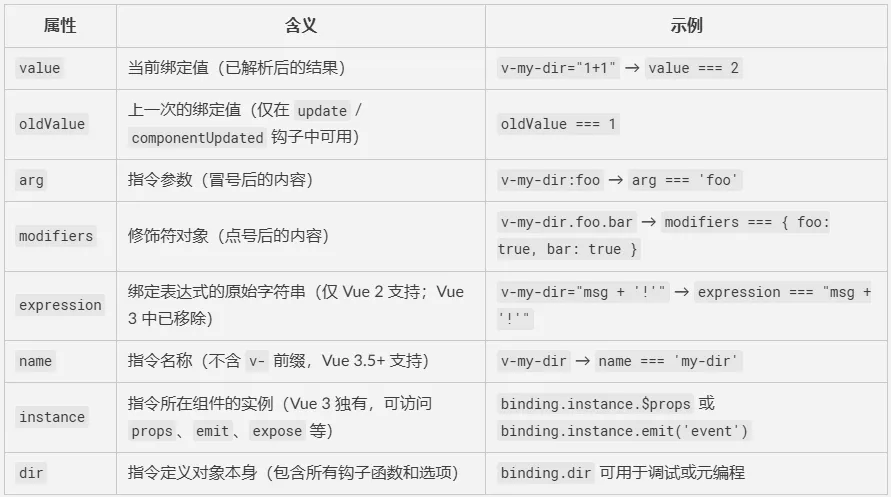在指令的每个钩子函数中,第二个参数binding 提供了完整的上下文信息: