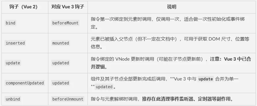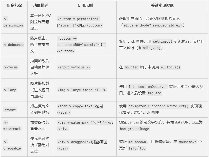 beforeUnmount清理 → 内存泄漏。 - ❌ 过度使用指令替代 CSS → 能用 CSS 解决的,别用 JS。