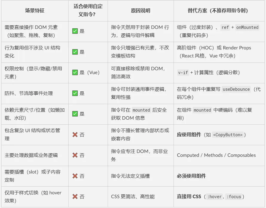 指令不是万能,最适合纯 DOM 操作、行为复用、不改变 UI 结构的场景。